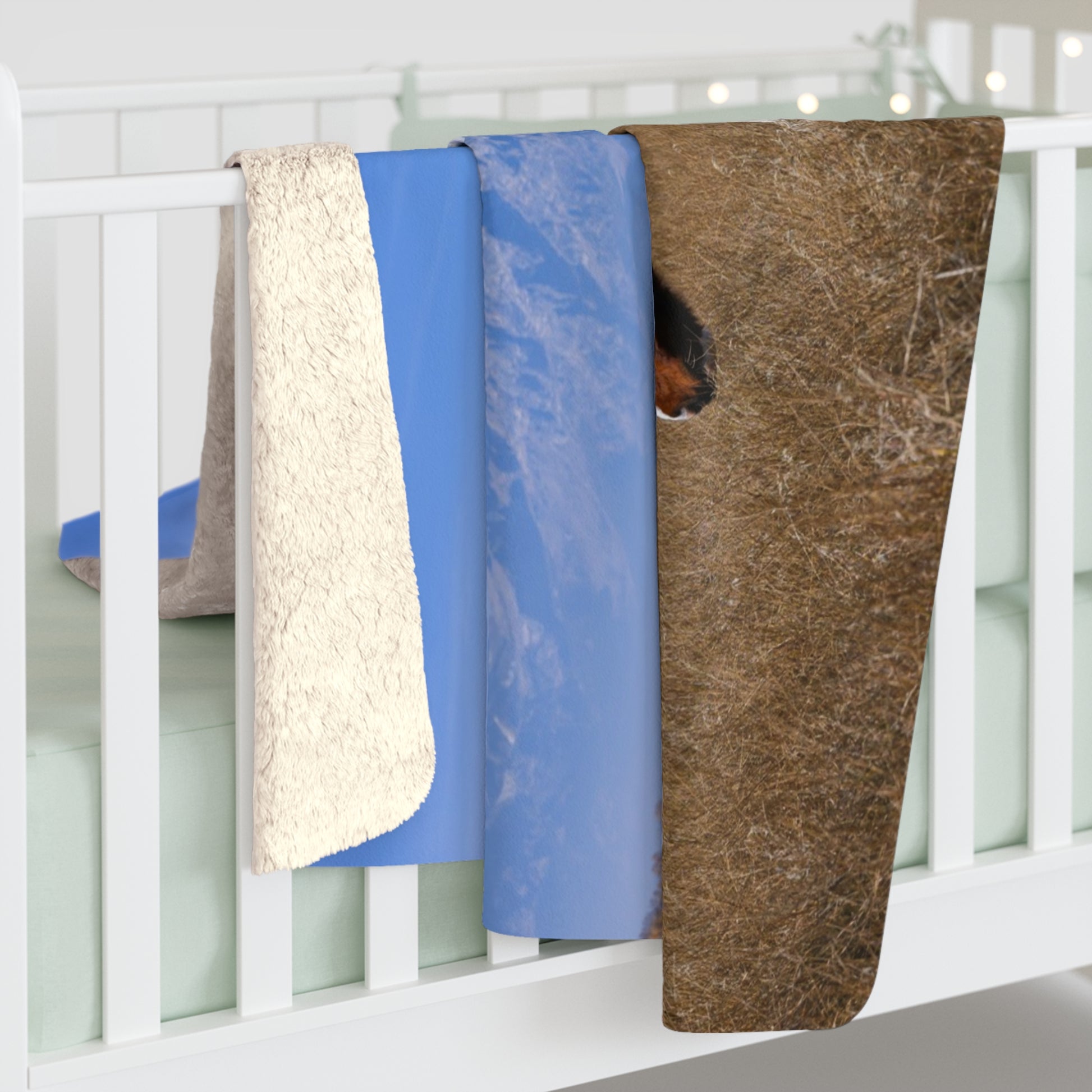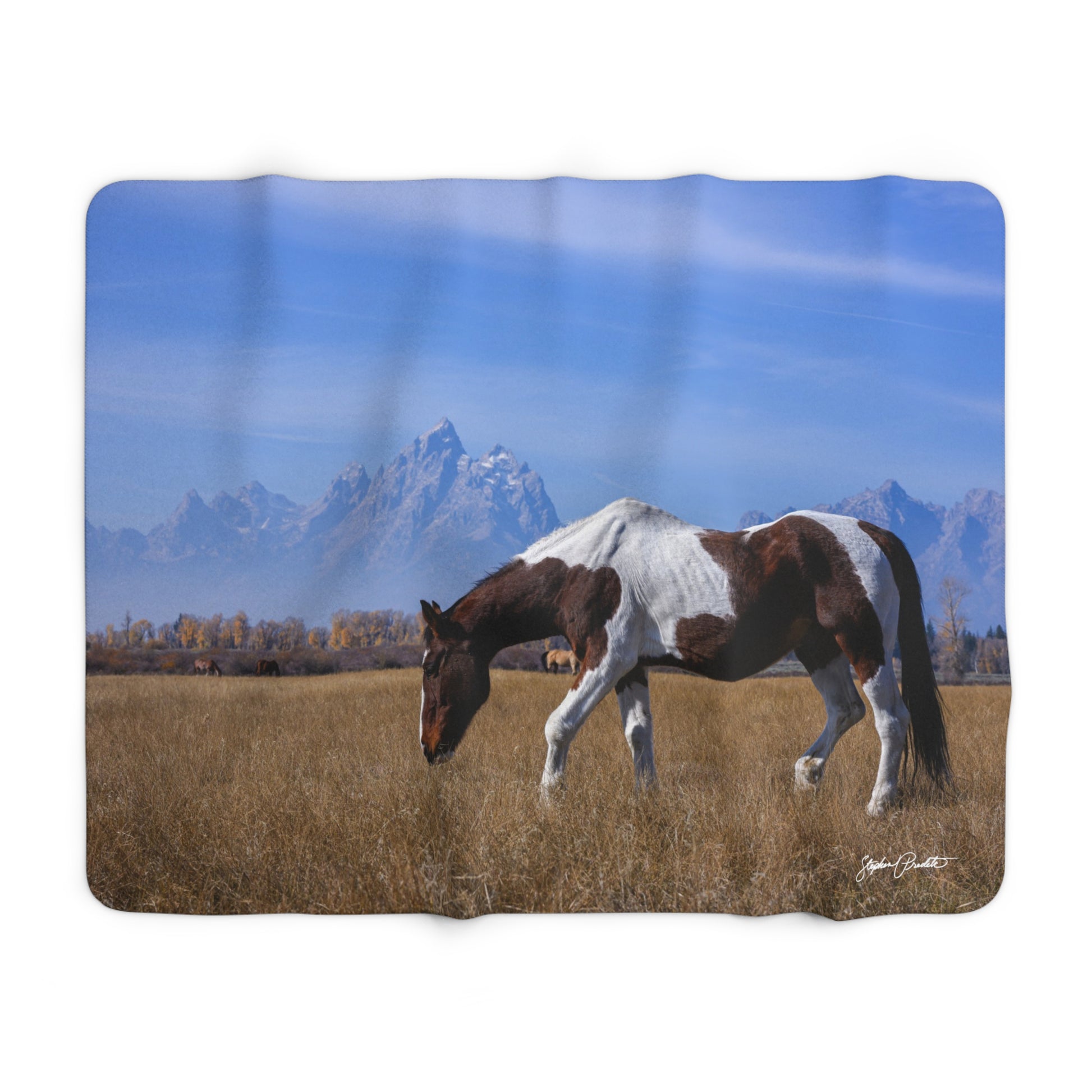 Stay warm and cozy with this Sherpa Fleece Blanket featuring Stephen's photo of a grazing paint horse with the Grand Tetons rising blue and steady behind them. The scene feels like a slow inhale: cool grass under hoof, mountain air sharpening the edges of light. Drape it over a reading chair after a long day, tuck it around your knees during an early winter dawn, or spread it across the foot of a bed to bring a landscape into your room. It’s made for people who collect moments — riders, meadow-lovers, and mountain dreamers — who want to keep a calm, wide-view memory within reach.