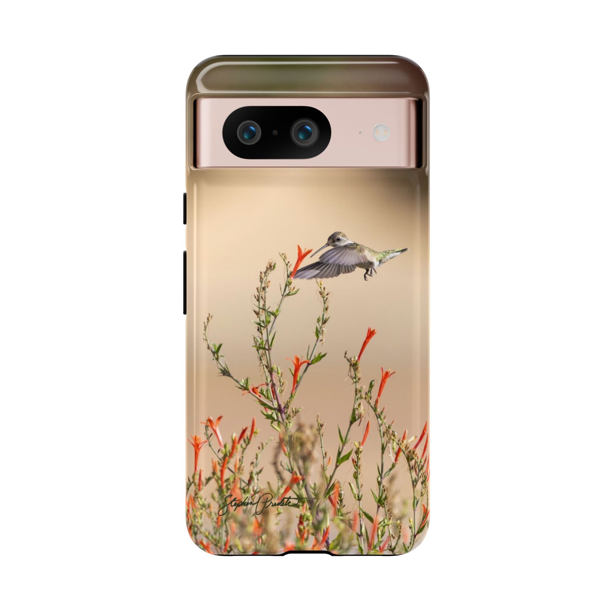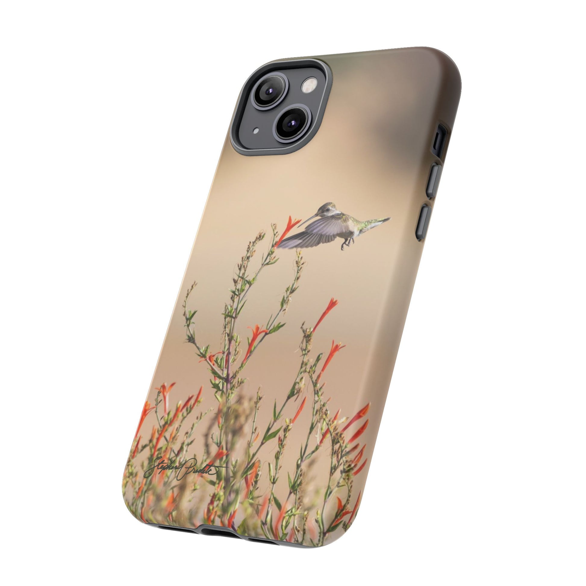 A durable and impact-resistant phone case featuring Stephen's beautiful photograph of a hummingbird coming to feed on the nectar of red flowers at White Rock Lake. This tough case offers excellent protection with a dual-layer construction and a TPU silicone liner for shock absorption. Perfect for nature lovers and those looking to add a touch of beauty to their everyday life. Ideal for gifting on birthdays, Mother's Day, or as a special treat for yourself.