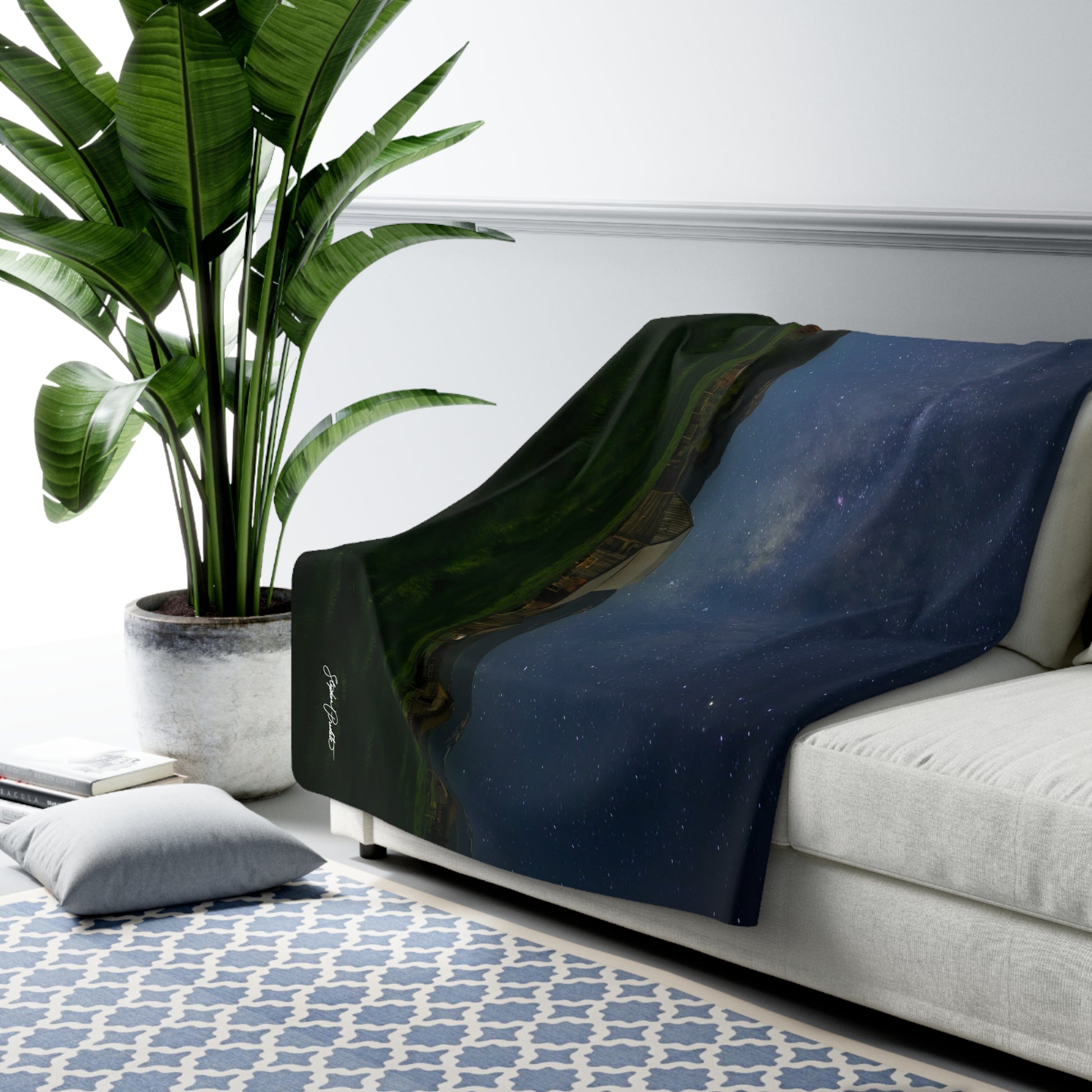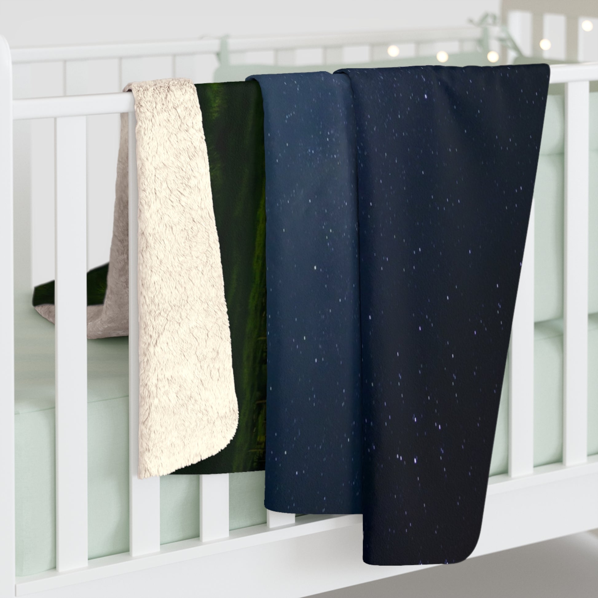 Stay warm and cozy with this Sherpa Fleece Blanket featuring Stephen's nighttime photo of the Milky Way over a farm in front of the Grand Teton Mountains in Wyoming. Perfect for stargazers and nature lovers, this blanket adds a touch of rustic charm to any living space. Ideal for snuggling up during cold winter nights or for a picnic under the stars during camping trips.
